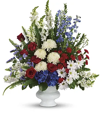 A classic all-American display of patriotic red, white and blue flowers pays tribute to the memory of one who proudly served his country, and is a testament to hope, freedom and strength.